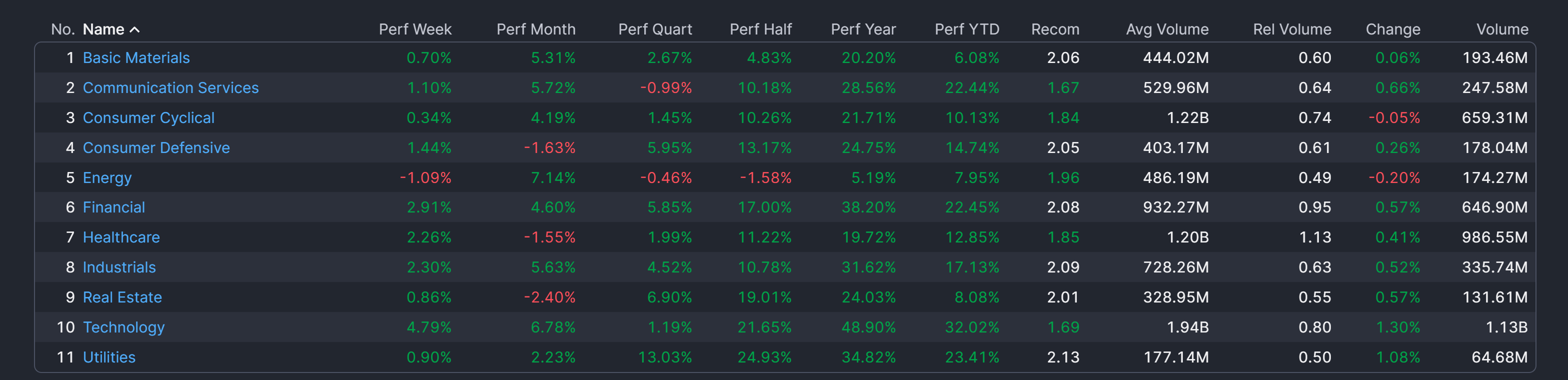 These are the 11 sectors and their performance during the last week, month, quarter, and year (credit:FINVIZ)